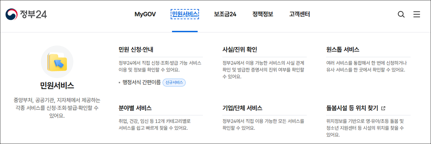 정부24는 정부의 민원 서비스, 정부혜택(보조금24), 정책정보/기관정보 등을 한 곳에서 한 눈에 찾을 수 있고 각 기관의 주요 서비스를 신청·조회·발급할 수 있는 대한민국 정부 대표 포털입니다